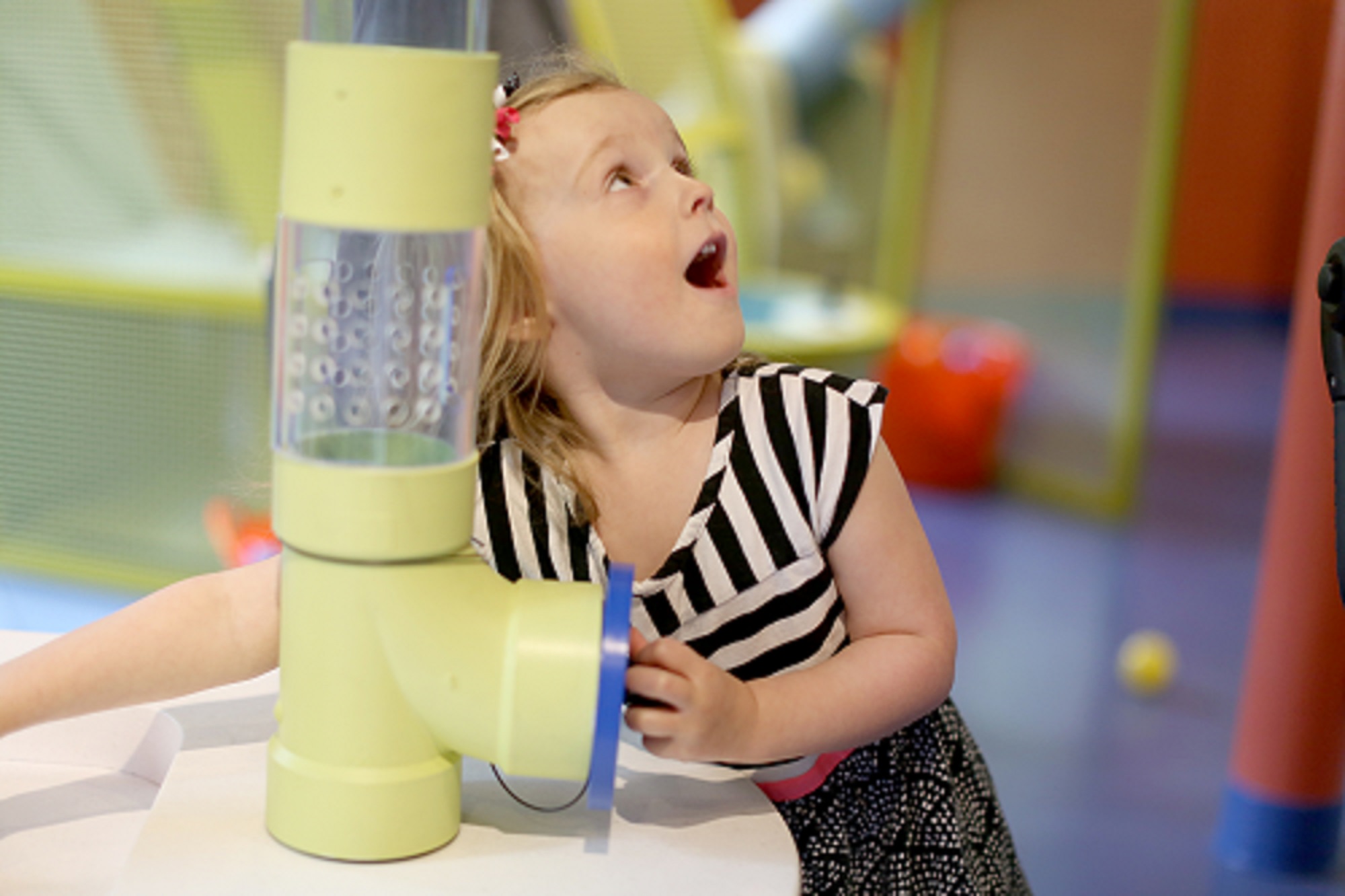 In a children’s museum, this means that when floor staff catch a child using a toy from one area in another area, they need to understand that that the child is likely experimenting (“I notice these wind tubes suck up balls. Will they suck up this plastic food, too?”). Which means they need intervention tactics which stop the child from potentially breaking an exhibit component by sending plastic food up an air tube meant for smooth round balls, while at the same time supporting experimentation generally, and re-directing the child’s curiosity to something that is less harmful to the museum. Which is no small task under the best of circumstances. In order to do this effectively, the staff person needs to embrace and recognize curiosity, to BE curious. To be able to genuinely say to the child, “I love that you are experimenting with things, but this one will break the machine. What are some other things we could try? Maybe we could see if the plastic food floats in the water table? Or if we can get two balls to go up the air tubes at once?”