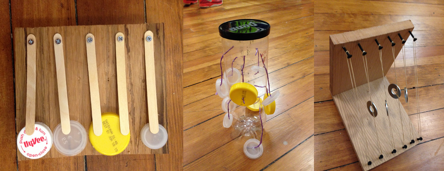 Three different visitor solutions to the prompt, “Make something that makes a sound,” in the PlayHouse Real Tools maker area.