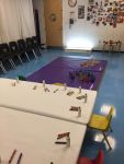 Each of these layouts serve a particular purpose, but it is key to first understand both our goals as educators and the perceived goals of the participants in order to decide which layout is most appropriate for a particular program. In an art class I teach for 2-3 year olds I always use Layout 1, because I find that in that setting, parents and caregivers tend to try and make the artwork for the child. Encouraging adults to sit on the sidelines allows me to model language and an educational approach without having to redirect adult behavior.