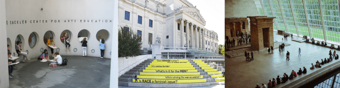 From left to right: Sackler Center for Arts Education at the Solomon R. Guggenheim Museum; an artwork presented by the Elizabeth A. Sackler Center for Feminist Art at the Brooklyn Museum, and the Sackler Wing at the Metropolitan Museum of Art. The Sacklers made their money through OxyContin.