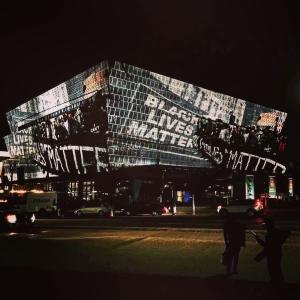 Now that it has opened, the museum is expected to respond to the difficult racial tensions in current day America. As early as 2015, its curators began collecting objects and images related to the Black Lives Matter movement, some of which are displayed in the context of the post-1968 struggle for civil rights. Yet the museum also made a more political statement with this collage of Black Lives Matter imagery on its building’s exterior.