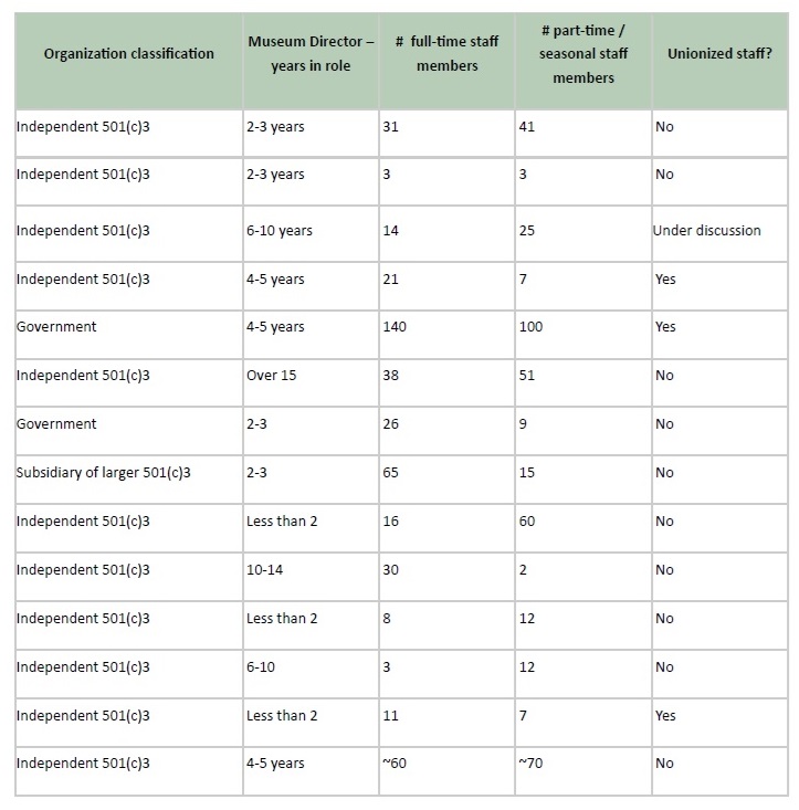 While we often talk very generally about “staff satisfaction” or “burnout” in museums, we do not have a shared literature on the ways in which museums create positive or challenging spaces in which to work. In order to understand organizational culture in museums, I interviewed 14 museum directors between January and June 2024. I asked questions about how they assess organizational culture, the problems that they are identifying, and how they address them. My goal in these interviews was to better understand climates and challenges specific to museums, and to begin to generate a tool kit of solutions. I’m grateful to have spoken with these fourteen museum directors, all of whom care enough about their staff and their organizational culture to have made time and space to think deeply about it, and to share their concerns, experiments, and ideas. I have anonymized all information; general information about the museums included is included as Appendix A. My interviewees included: