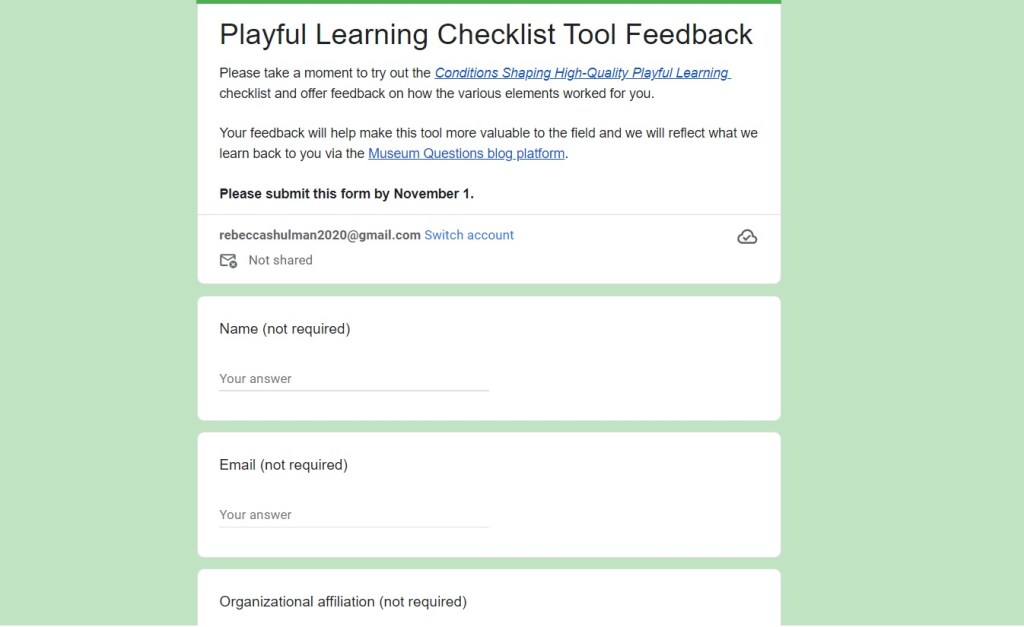 We invite you to view our presentation, download our “Conditions Shaping High-Quality Playful Learning” checklist, and/or share your feedback on the checklist.