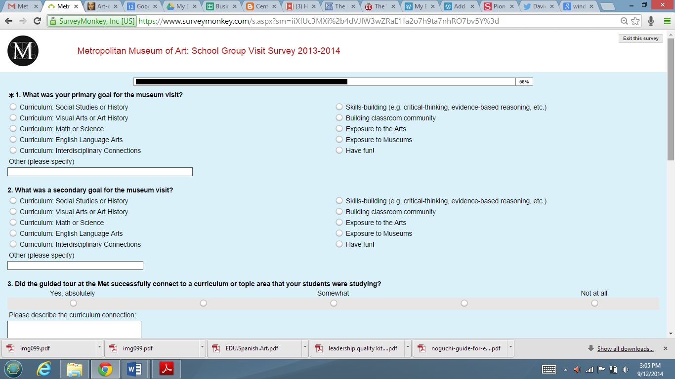 The Met sends out a post-visit evaluation form to teachers. We ask about primary and secondary goals for trips. Last year, 68% of teachers said that their primary goal for school tours here is a curriculum connection. The highest ranking secondary goal was“exposure to the arts – 28% of teachers chose that. 18% chose skill building, and even fewer chose “fun.”