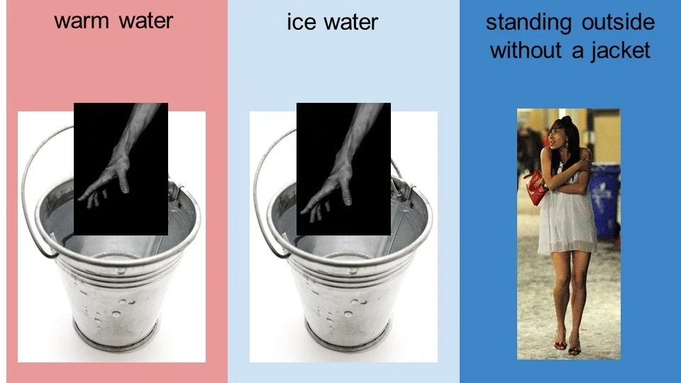 Participants in a study were asked to imagine being a student who was being punished by standing out in the cold without a jacket. The participants were divided into three groups. One third of participants were asked to stand out in the cold themselves. One third of participants were asked to keep their arm in a bucket of ice water. And one third of of participants were asked to keep their arm in a bucket of warm water.