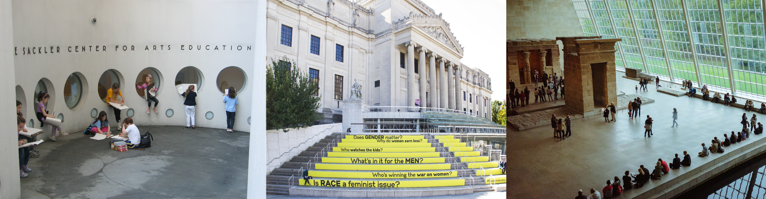 From left to right: Sackler Center for Arts Education at the Solomon R. Guggenheim Museum; an artwork presented by the Elizabeth A. Sackler Center for Feminist Art at the Brooklyn Museum, and the Sackler Wing at the Metropolitan Museum of Art. The Sacklers made their money through OxyContin.