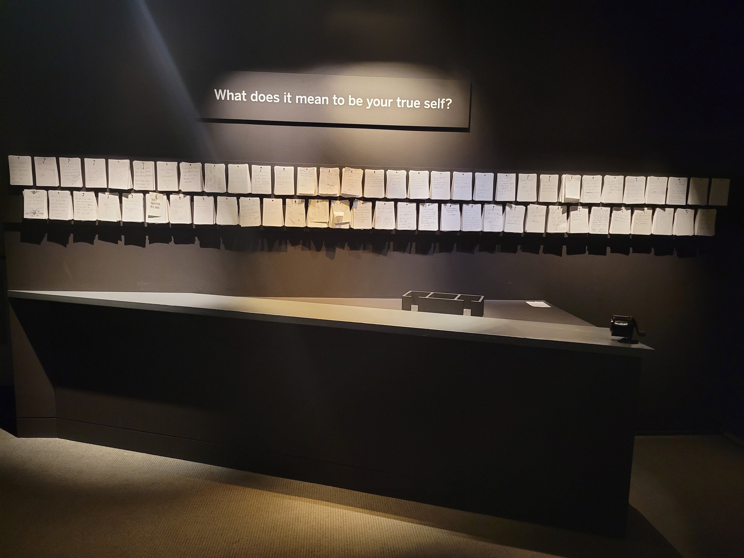 We have one prompt for an artwork called Question Bridge: Black Males, which is a video installation. The talkback station asks the question, “What does it mean to be your true self?” We don’t ask about the work of art – we ask visitors a question about identity. The question is at a station that consists of little nails around the wall and nicely-printed cards on high-quality paper stock. This station is in a hidden corner – a lot of nonsense could happen back there, because it's not being closely monitored. But we don't get nonsense: we get very little profanity, and very little that is off-topic. We get a lot of rich personal reflections in that space.